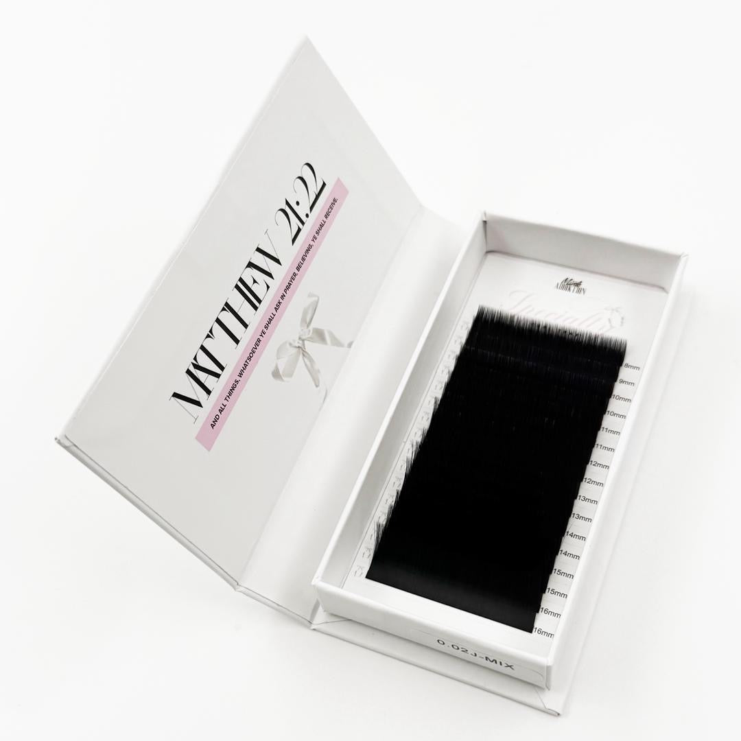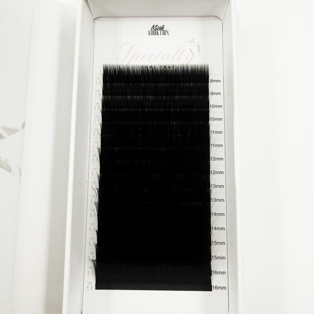 Designed to add texture and depth to your clients' lashes, our trays feature the popular specialty curls ; J and B, with 16 rows of mixed lengths 8-16mm, with a .02 diameter, intended to give you endless possibilities for customization.